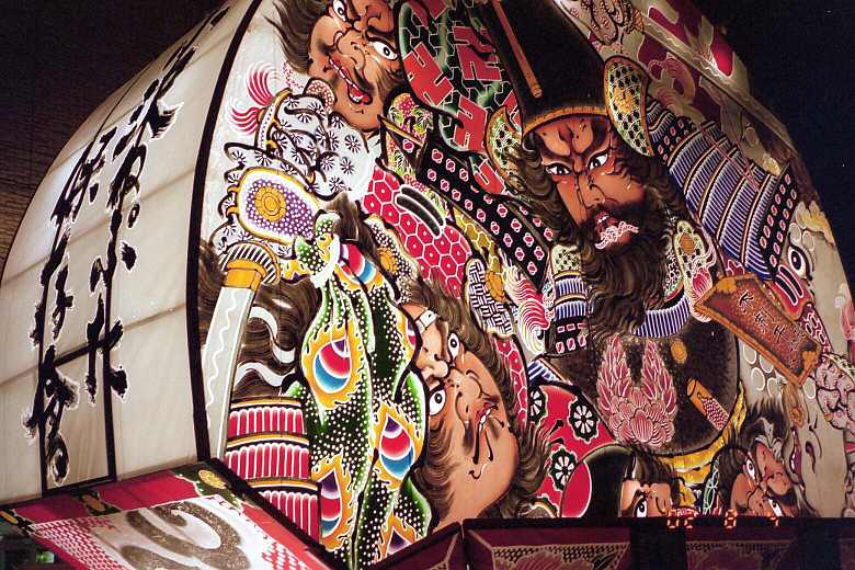 弘前のおまつりはね「ぷ」たです。半濁音です。青森のは濁音でね「ぶ」た。明確に区別されているようですが 双方共に語源は「眠たい」から来ているようです。弘前のねぷたは「扇ねぷた」と言って、ご覧の通り竹と和紙で組んだ 扇状の山車に勇壮な歴史的な一場面が描かれています。画像に見えている側が表で、表に描かれる絵を「鏡絵」 裏側に描かれる絵を「送り絵」と言います。通りを練り歩きながら時折止まって山車をぐるぐるっと一回転、二回転させて アピールします。大きさは最大のもので幅6〜7m、高さ4〜5mで、電線を避けるために山車自体が1m程度上下したり 山車の先端部分が畳める構造になっています。太鼓や笛などのお囃子に乗って弘前の街を練り歩きます。 |